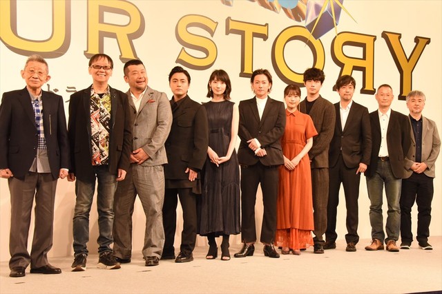 映画「ドラゴンクエスト ユア・ストーリー」完成報告記者会見の様子。左からすぎやまこういち、堀井雄二、ケンドーコバヤシ、山田孝之、波瑠、佐藤健、有村架純、坂口健太郎、山崎貴総監督、八木竜一監督、花房真監督。