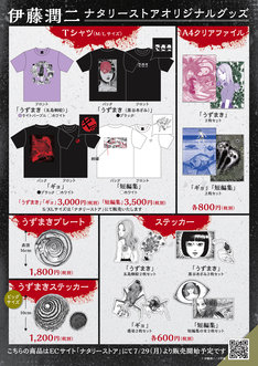 「伊藤潤二 POP UP STORE」には、「うずまき」「ギョ」「富江」などの作品から、伊藤のイラストを使用したTシャツ、トートバッグ、スマホケースなどさまざまなグッズを用意。全面にプリントが施された少し不気味な「うずまき」の直径16cmの皿や、ビッグステッカー、「短編集 BEST OF BEST」から「frankenstein in Innsmouth」「阿彌陀羅断層の怪」といった作品をモチーフにしたアイテムも取り揃えられている。