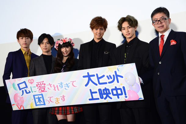 夜神里奈原作による実写映画「兄に愛されすぎて困ってます」の初日舞台挨拶が、昨日6月30日に東京・丸の内ピカデリーで開催。橘せとか役の土屋太鳳、橘はるか役の片寄涼太(GENERATIONS from EXILE TRIBE)、芹川高嶺役の千葉雄大、美丘千秋役の草川拓弥(超特急)、芹川国光役の杉野遥亮、河合勇人監督が登壇した。