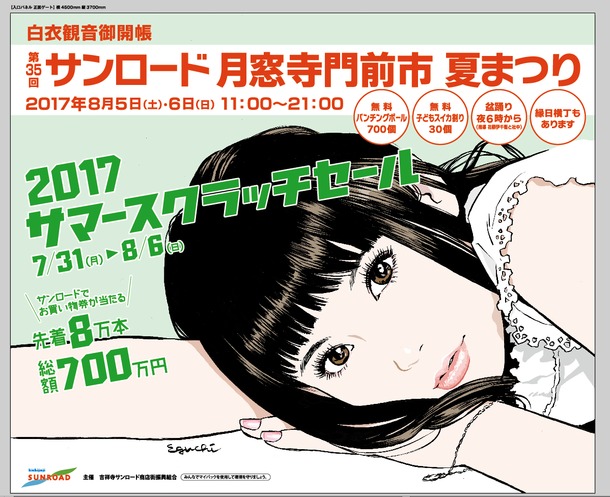 なおスクラッチカードは7月31日よりセール対象店舗にて配布を開始。パネルやフラッグは8月5日・6日に開催される「サンロード月窓寺門前市 夏まつり」が終わるまで掲出される。