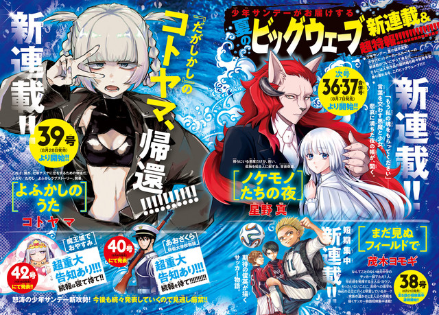 8月7日発売の次号36・37合併号では、星野真が悪魔と少女を描く新連載「ノケモノたちの夜」が開幕。8月28日発売の39号ではコトヤマによる“よふかしラブストーリー”「よふかしのうた」が始動する。また8月21日発売の38号からは茂木ヨモギによる全5話の短期集中連載「まだ見ぬフィールドで」がスタートする。