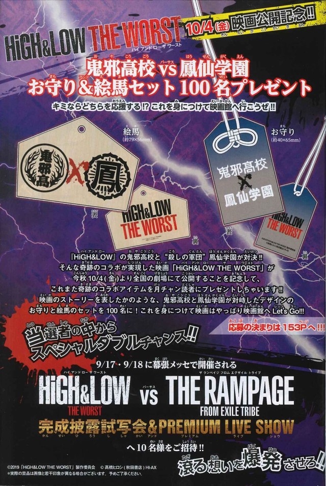 高橋ヒロシ「クローズ」「WORST」と、EXILE HIROがプロデュースする「HiGH&LOW」シリーズがコラボした「HiGH&LOW THE WORST」。今号では鬼邪高校と鳳仙学園の校章がデザインされた絵馬と、学校名がプリントされたお守りをセットで、100名にプレゼントする。さらに当選者の中から10名を、9月17日と18日に千葉・幕張メッセで開催される映画の完成披露試写イベント「HiGH&LOW THE WORST VS THE RAMPAGE from EXILE TRIBE 完成披露試写会&PREMIUM LIVE SHOW」に招待する。応募の詳細などは誌面で確認を。なお9月6日発売の次号10月号では、「HiGH&LOW THE WORST」に出演する吉野北人、川村壱馬が表紙を飾り、巻頭グラビアとインタビューにも登場する。