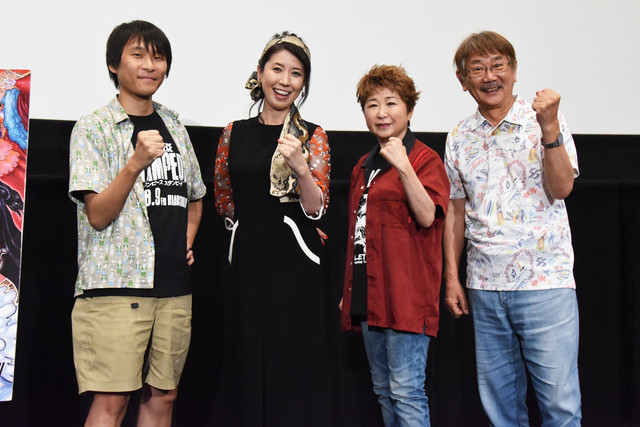 イベントにはルフィ役の田中真弓、バギー役の千葉繁、ハンコック役の三石琴乃、大塚隆史監督が登壇。田中は映画のヒットを受け、本日会場に来ているという大塚監督の母親に成り代わり「皆さま、隆史がお世話になっております。私、母として幸せでございます!」とジョークを飛ばす。司会が「あれ、大塚監督のお父さまも来ていらっしゃるんですか……?」と振ると、千葉が「はいはい、お父さんです!」と返事。興行収入約30.5億円を記録したことに触れ、「30億円って、電子タバコ何個買えるんですか!?」と興奮した様子を見せる。三石も「大塚の……娘でございます」とのっかると、田中から「監督の娘ってこんなに大きいんだ」とツッコミが。三石はすぐさま子供の声色に変え、「みんな、パパをみんなで応援してあげてね!」と呼びかけた。