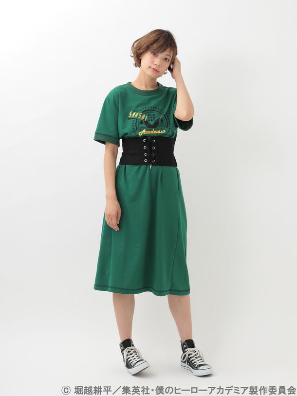 用意されたのはプルオーバー、ワンピース、Tシャツ、トートバッグ2型の計5アイテム。プルオーバーとワンピースは主人公の緑谷出久をイメージしており、ヒーロースーツやノートのイラスト、「ONE FOR ALL」の文字を組み合わせたエンブレムがあしらわれている。