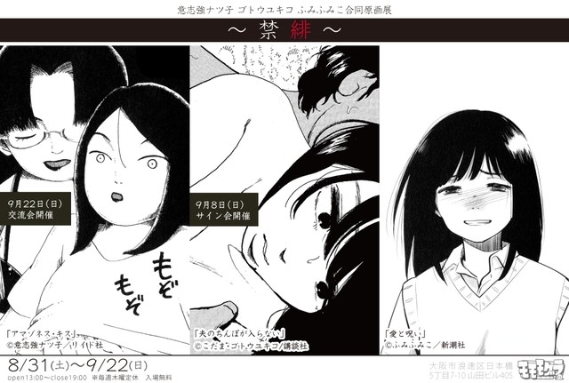 「意志強ナツ子・ゴトウユキコ・ふみふみこ合同原画展~禁緋~」と題された本展は、今を生きる女性の“誰にも言えない秘密や理想と現実を描き出す”女性3作家の三者三様の性のあり方、向き合い方をテーマにしたもの。また会場では原画展特製のグッズが販売されるほか、9月8日にはゴトウのサイン会が、9月22日には意志強のサイン会&トークショーと交流会も開催される。