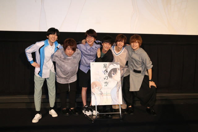 赤根和樹が原作・脚本・監督を務める「星合の空」は廃部寸前の男子ソフトテニス部を舞台に、悩みを抱える少年たちの姿を描くオリジナル作品。上映後のトークショーには桂木眞己役の花江夏樹、新城柊真役の畠中祐、雨野樹役の松岡禎丞、竹ノ内晋吾役の佐藤圭輔、石上太洋役の天崎滉平が登壇し、MCを飛鳥悠汰役の山谷祥生が担当した。1・2話を観終えたばかりの観客に、本作の舞台・志城南中学のジャージを着た山谷が感想を尋ねると、客席からは大きな拍手が贈られる。シリアスな作品のムードとは反対に、明るいテンションでトークパートに臨もうとする一同は、先日発表されたばかりの天崎の写真集発売決定を祝うなど、終始和気あいあいとしたムードでトークを繰り広げた。