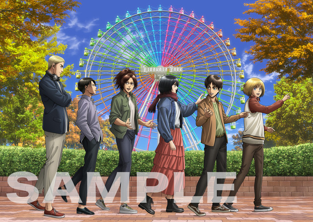 9月21日から12月1日まで大阪・ひらかたパークにて開催される「進撃の巨人展FINAL inひらかたパーク」。大阪会場限定となる描き下ろしイラストには、ひらかたパークの大観覧車をバックにエレン、ミカサ、リヴァイらが楽しげに並ぶ姿が描かれた。また公式グッズショップ「リーブス商会 ヒラカタ直営店」では150点以上ものアイテムがラインナップ。東京会場で人気だったキャラクターグッズをはじめ、大阪会場より販売が開始される新規グッズも登場する。さらに、ひらかたパーク園内にてコラボカフェ「リーブス商会CAFE ヒラカタ支店」もオープンする。