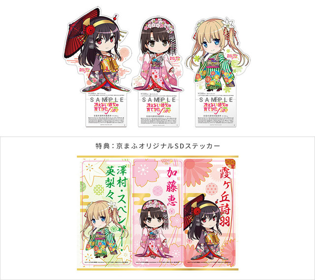 「京まふオリジナルSDクリア前売券」は、キャラクター原案・深崎暮人が過去に手がけた和服姿の恵、英梨々、詩羽のビジュアルをデフォルメして使用したもの。前売券を1枚購入するごとに、同イラストのステッカーがプレゼントされる。また会場では同イラストのアクリルジオラマや、“blessing software”のロゴが入った京都の老舗・白竹堂製の紙扇子といったオリジナルグッズも販売。なお「京まふオリジナルSDクリア前売券」および「京まふ」オリジナルグッズは、東京・秋葉原のANIPLEX+アンテナショップでも9月23日より販売される。