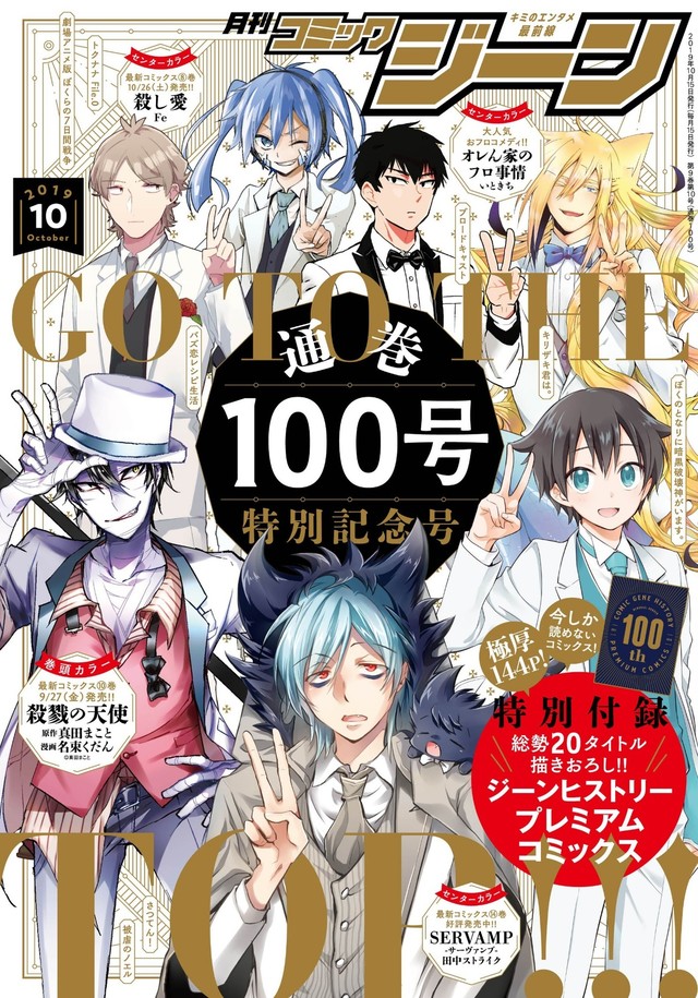 「ジーンヒストリープレミアムコミックス」ではジーンの作家陣が描き下ろした、“記念日”がテーマの特別マンガを収録。「SERVAMP-サーヴァンプ-」の田中ストライクは、コミックジーンの軌跡を総括するマンガ「ジーン100号記念クエスト」も執筆している。「ぼくのとなりに暗黒破壊神がいます。」の亜樹新、「BRAVE10 S」の霜月かいり、「殺戮の天使」の名束くだんのインタビューも掲載された。