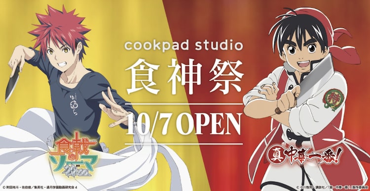 附田祐斗・佐伯俊原作によるTVアニメ「食戟のソーマ 神ノ皿(しんのさら)」と、小川悦司原作によるTVアニメ「真・中華一番!」がコラボ。10月7日から31日まで、大阪・cookpad studio 心斎橋にて「cookpad studio 食神祭(しょくしんさい)」が開催される。