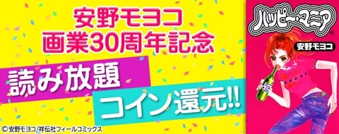 同キャンペーンでは、安野の一部作品を読み放題プランのラインナップに追加。「ハッピー・マニア」の1巻から5巻までや、同作の続編「後ハッピーマニア」の連載を9月にスタートさせたフィール・ヤング(祥伝社)も一部読み放題として配信されている。また「新装版 ジェリー イン ザ メリィゴーラウンド」「カメレオン・アーミー」「バッファロー5人娘」「ツンドラ ブルーアイス」「オチビサンとおるすばんのくに」に加え、「鼻下長紳士回顧録」「オチビサン」などの一部も対象に。そのほか全巻、購入額の30%がコインとして還元される。詳細はブックパスのキャンペーンページで確認を。