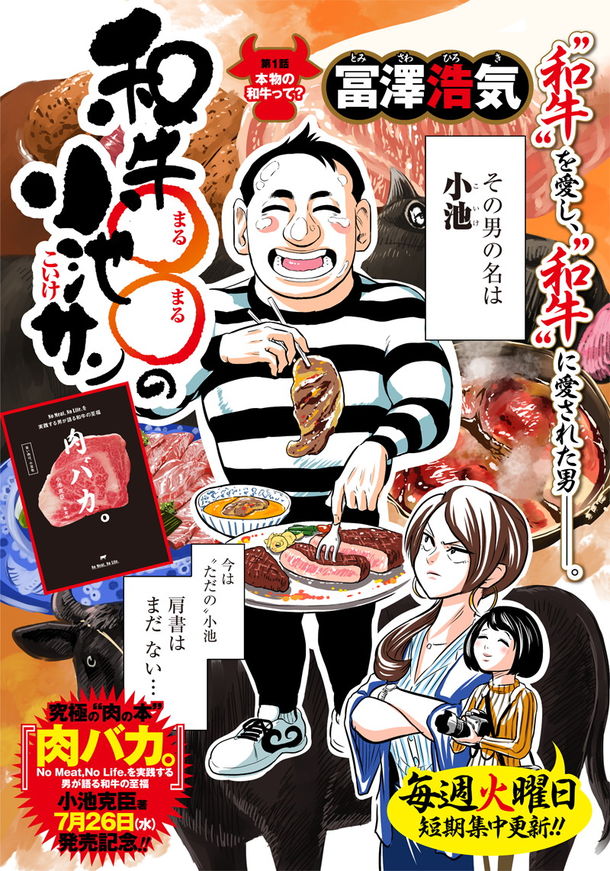「和牛○○の小池サン」は、和牛肉の魅力を紐解く小池の著書「肉バカ。No Meat,No Life.を実践する男が語る和牛の至福」が7月26日に発売されることを記念したルポマンガ。年間200食以上牛肉を食べるという小池の人となりにはじまり、和牛肉の知識や名店などを紹介していく。同作は毎週火曜日に更新される。
