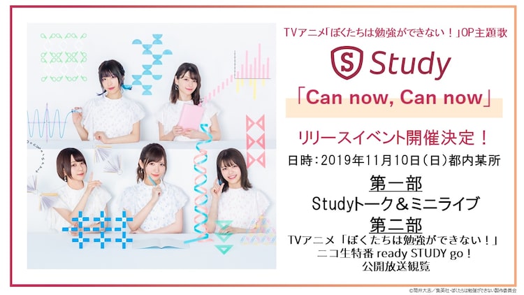 筒井大志原作によるTVアニメ「ぼくたちは勉強ができない!」の出演声優からなるユニット・Studyの2ndシングル「Can now, Can now」のリリース記念イベントが、11月10日に東京都内で開催される。