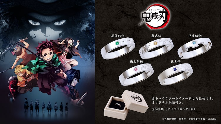 登場したのは竈門炭治郎、我妻善逸、嘴平伊之助、竈門禰豆子、冨岡義勇をそれぞれイメージした5種。炭治郎モデルは表面に翠玉の天然石があしらわれ、彼が着用している半纏の市松模様がデザインされている。また内側には鬼殺隊服の背に描かれている「滅」を黒いぶしで刻印。そのほかのリングもキャラクターをイメージした色の天然石と、それぞれを象徴する模様などが取り込まれた。