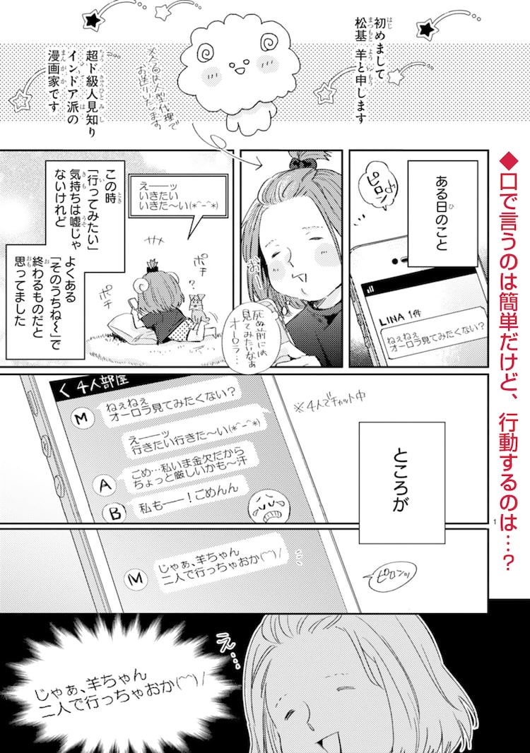 人見知りなインドア派がカナダにオーロラを見るため旅行に、旅ポラリス新作 2019年10月3日2019年10月3日 editor 「3泊4日ホワイトホース オーロラツアーの旅」より。松基羊による読み切り「3泊4日ホワイトホース オーロラツアーの旅」が、COMICポラリスにて本日10月3日に公開された。 同作は毎回異なる作家が、旅にまつわるショートエッセイマンガを描く連載「旅ポラリス」の一環として配信されたもの。人見知りでインドア派だという松基が、成り行きから当時友人の友人程度の関係性だったという女性と2人で、カナダ・ホワイトホースに3泊4日でオーロラを見に出かけた様子が描かれている。 関連記事初恋の人はほんわか美女の吸血鬼、人外ラブコメ「なごみ吸血鬼のこごみさん」1巻キスマイ宮田俊哉の小説「境界のメロディ」アニメ化!声優は伊東健人、佐久間大介ら続投「閃光のハサウェイ キルケーの魔女」マフティーのメンバーに白熊寛嗣、永瀬アンナらインテリアコーディネーター見習いの男子2人のほっこり同居譚「メイク・ディア・ホーム」CLAMP作品の新装版シリーズに「CLOVER」が登場、カバーはCLAMPの描き下ろしみきもと凜の最新作「宝石箱に愛をつめよう」1巻、“再生”を描くラブストーリー Tweet