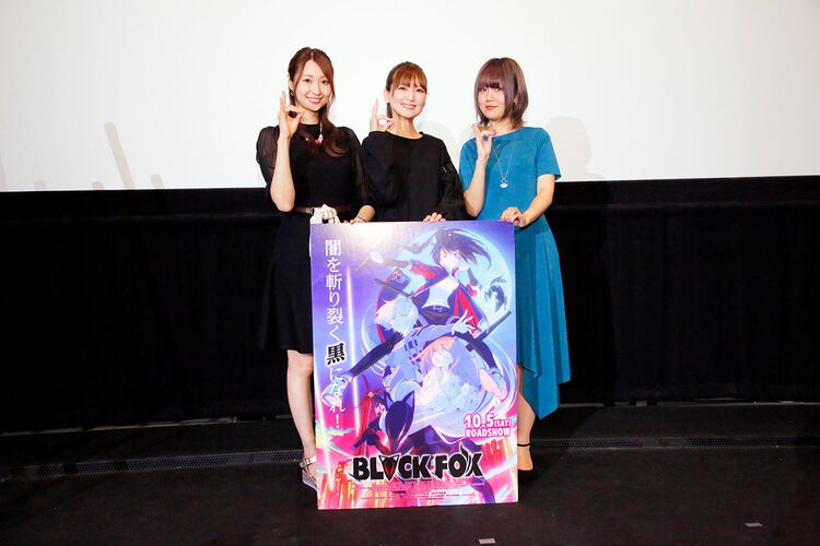 「BLACKFOX」は近未来の大都市を舞台に、忍者一族の長女である石動律花の活躍を描いたオリジナルSFアクション作品。総監督を野村和也、監督を篠原啓輔、脚本をハヤシナオキ、制作をStudio 3Hzが担当している。七瀬は「オーディション、アフレコから待ちに待った公開となりました。たくさんのスタッフさんが関わり、公開まで時間がかけられた作品なので、皆様の感想を聞くのが楽しみです」と緊張しつつも感謝をこめて挨拶。MCから本作を観ての感想を尋ねられると、3人は「アクションシーンの迫力がすごい」と口を揃え、大きいスクリーンで観られることへの喜びを語った。