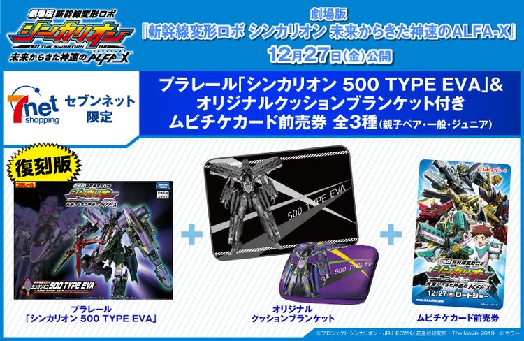限定グッズには、2017年に数量限定で発売され現在は生産が終了しているプラレール「シンカリオン 500 TYPE EVA」と、「シンカリオン 500 TYPE EVA」のビジュアルを使用したクッションブランケットのセット、「シンカリオン E5はやぶさ MkII」と「シンカリオン ALFA-X」のビジュアルを使用したポシェットの2種がラインナップ。それぞれ親子ペア券、一般券、ジュニア券の3種類のムビチケカードとセットで販売されるほか、グッズのみの購入も可能だ。価格や商品の詳細はセブンネットショッピングのWebサイトで確認を。