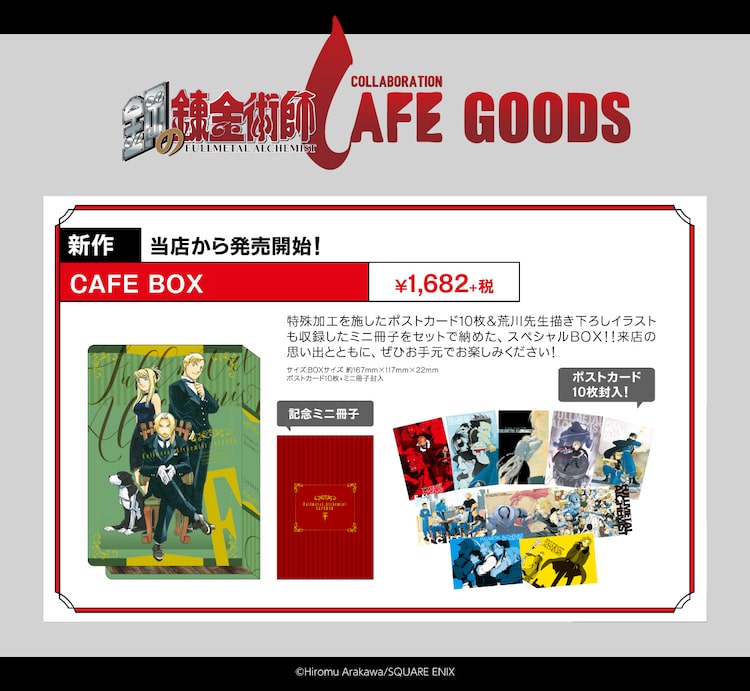 カフェ開催に合わせて発売される「CAFE BOX」は、特殊加工を施したポストカード10枚とミニ冊子がセットになったアイテム。ミニ冊子には今回のカフェ用に荒川弘が描き下ろしたイラスト、4コママンガが収録されている。さらに全国巡回中の「鋼の錬金術師展」の会場でも販売された「プレミアム複製原画」「複製原画」も、数量限定で登場する。