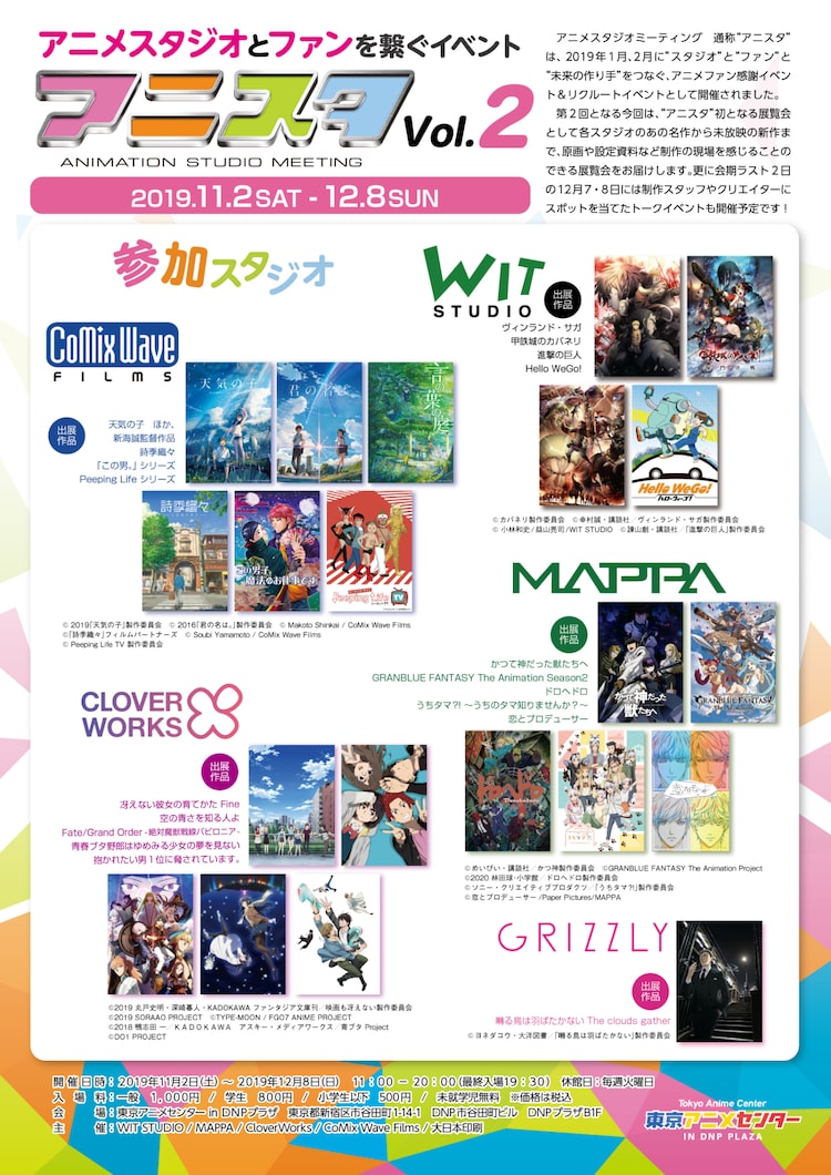 1月から2月にかけて第1回が開催された「アニメスタジオミーティング」は、アニメの制作スタジオとアニメファン、アニメ業界志望者をつなぐことを目的としたイベント。2回目となる今回はWIT STUDIO、MAPPA、CloverWorks、コミックス・ウェーブ・フィルム、GLLIZRYの5社が参加し、各スタジオが手がける作品の制作資料を展示するほか、会期終盤の12月7日・8日の2日間には会社説明会とスタッフトークショーが行われる。展示作品にはWIT STUDIOから「進撃の巨人」「甲鉄城のカバネリ」「ヴィンランド・サガ」「Hello WeGo!」、MAPPAから「かつて神だった獣たちへ」「GRANBLUE FANTASY The Animation」「ドロヘドロ」「うちタマ?! ~うちのタマ知りませんか?~」「恋とプロデューサー」、GRIZZLYから「囀る鳥は羽ばたかない The clouds gather」、CloverWorksから「冴えない彼女の育てかた Fine」「空の青さを知る人よ」「Fate/Grand Order -絶対魔獣戦線バビロニア-」「青春ブタ野郎はゆめみる少女の夢を見ない」「抱かれたい男1位に脅されています。」、コミックス・ウェーブ・フィルムから「天気の子」ほか新海誠監督作品、「詩季織々」「この男子、魔法がお仕事です。」「Peeping Life」シリーズがラインナップされた。