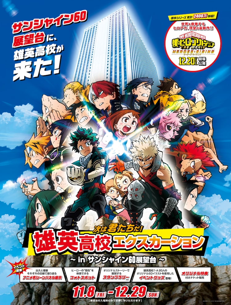 堀越耕平原作による劇場アニメ「僕のヒーローアカデミア THE MOVIE ヒーローズ:ライジング」と東京のSKY CIRCUS サンシャイン60展望台がコラボレート。イベントが同展望台にて11月8日から12月29日まで開催される。
