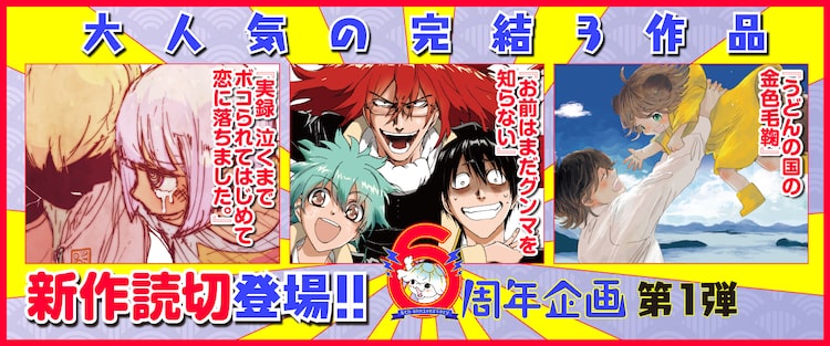 第1弾では、井田ヒロト「お前はまだグンマを知らない」、篠丸のどか「うどんの国の金色毛鞠」、ペス山ポピー「実録 泣くまでボコられてはじめて恋に落ちました。」といった完結3作品の新作読み切りを公開。第2弾ではアンケートに答えると、連載作家によるサイン色紙が当たるキャンペーンが行われている。色紙プレゼントの応募期間は、本日から11月7日まで。詳細はくらげバンチの編集部ブログにて確認を。