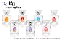 ラインナップされたのは以前発売されたスバル、エミリア、ラインハルト、ユリウスモデルのパッケージと容器をリニューアルしたものに、新たにレム、ラム、ベアトリスモデルを加えた7種。レムモデルはトップにレモンやピーチ、グリーンアップルが用いられ、みずみずしい果実の香りが立ち昇るフルーティーなマリンノートに仕上げられた。ラムモデルはピーチやオレンジの甘酸っぱい香りが、ローズのフローラルな香りへと変化していくフレグランス。ベアトリスモデルはトップにピーチ、ミドルにコットンキャンディなどを使用した、甘やかで不思議な印象の香水だ。