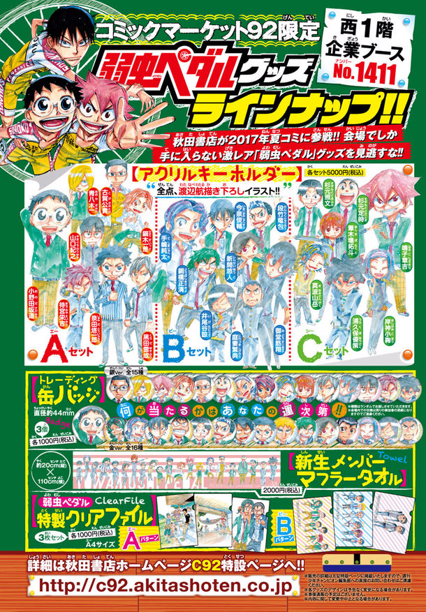 渡辺航「弱虫ペダル」のグッズが8月11日から13日にかけて東京ビッグサイトで開催されるコミックマーケット92の秋田書店ブース(No.1411)で販売される。