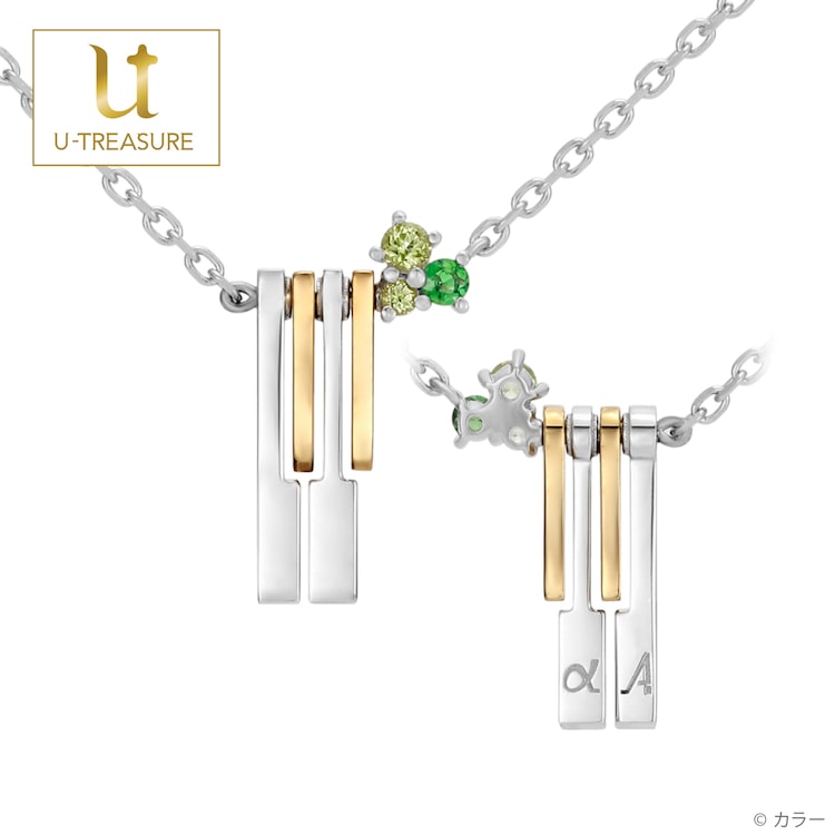 「シンジとカヲルの連弾 ネックレス」のトップはピアノの鍵盤を模したモチーフ。裏側にはエヴァンゲリオン第13号機のダブルエントリーシステムに刻まれた“A”と“α”の文字が印されている。鍵盤の隣にあしらわれたペリドットとグリーントルマリンは、作中でピアノの傍らに佇む木をイメージしたものだ。