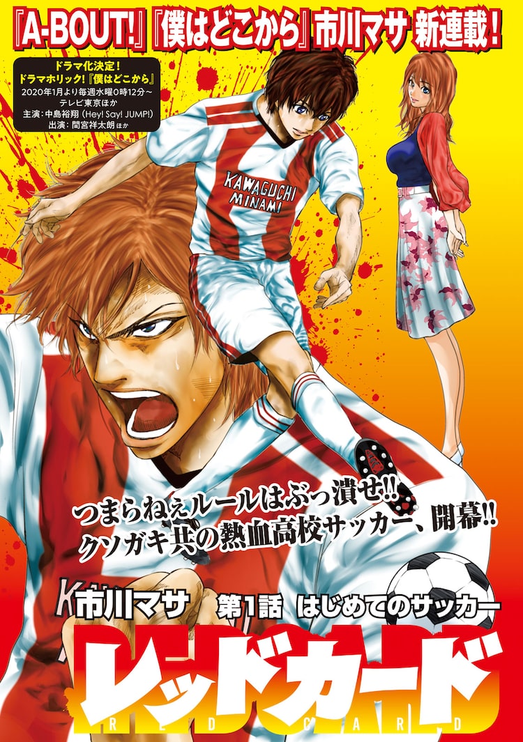 「A-BOUT!」「レッドカード」などで知られる市川の最新作「レッドカード」は、女の子のような見た目の大人しい男子高校生・佐藤由紀虎(ユキコ)を中心とした高校サッカーマンガ。自宅で1人ボールを蹴る生活を送っていた由紀虎だが、ヘタレな自分を変えるべく高校のサッカー部に入部する。そんな中、由紀虎は練習試合に出ることになって……。由紀虎の憧れの先輩でエースストライカーの高梁誠、サッカー部顧問の国語教師・森美彩らと出会い、成長していく由紀虎の姿が描かれる。