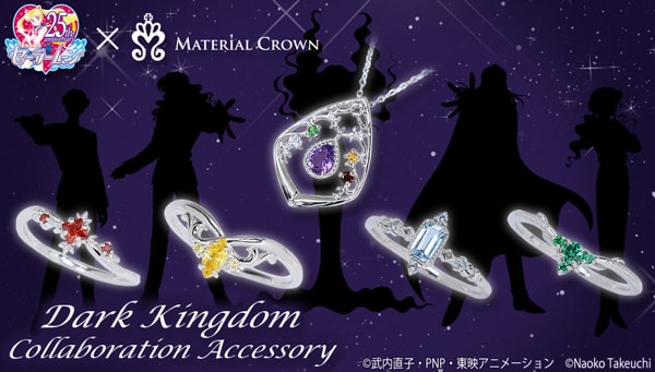 ラインナップされたのは「美少女戦士セーラームーン」にダーク・キングダムの5人をイメージしたネックレス1種と、ダーク・キングダム四天王のジェダイト、ネフライト、ゾイサイト、クンツァイトをイメージしたリング4種。「美少女戦士セーラームーン×MATERIAL CROWN ダーク・キングダムイメージネックレス」は、クイン・ベリルが着用しているイヤリングのティアドロップ形状から着想したフレームデザインに、5人をイメージしたカラーのストーンがあしらわれた。また「美少女戦士セーラームーン×MATERIAL CROWN ダーク・キングダム四天王イメージリング」は、4種類の異なるカット・カラーのストーンを主役に、上品なデザインに仕上げられた。