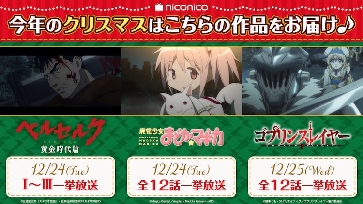 TVアニメ「魔法少女まどか☆マギカ」全話および映画「ベルセルク 黄金時代篇」3部作がクリスマスイブの12月24日19時から、TVアニメ「ゴブリンスレイヤー」全話がクリスマス当日の25日19時から、それぞれニコニコ生放送にて一挙放送される。
