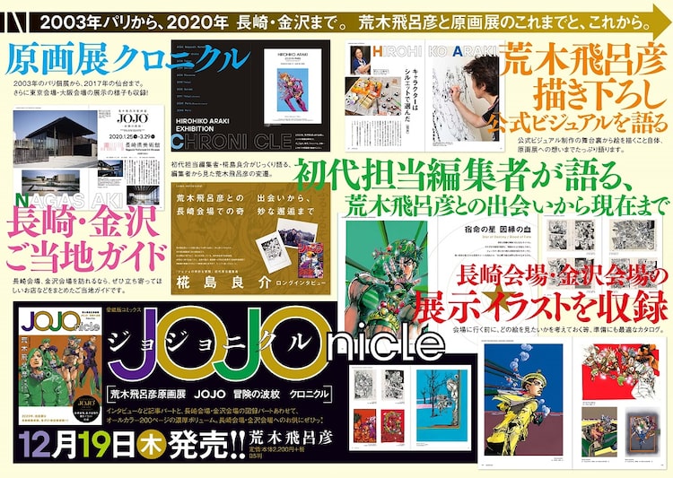 「JOJOnicle」は長崎・長崎県美術館で2020年1月25日から3月29日まで、石川・金沢21世紀美術館で4月25日から5月23日まで開催される「荒木飛呂彦原画展 JOJO 冒険の波紋」のイラストなどを収録した公式図録本。長崎、金沢会場のために描き下ろされた公式ビジュアルを含む展示イラストのほか、荒木や初代担当編集者・椛島良介へのインタビュー、 長崎、金沢のご当地ガイド、これまでに行われてきた荒木の原画展の紹介などが収められている。