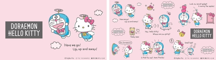 2015年にスタートした「ドラえもん」とハローキティのコラボ企画。このたび登場した新たなコラボデザインシリーズでは、ドラえもんとハローキティがひみつ道具やリボンなどお互いのお気に入りのモチーフで仲良く遊んでいる様子がデザインされた。ドラえもんはハローキティのリボンを、ハローキティはドラえもんの鈴やタケコプターを付けたマスコットホルダーや、リバーシブルクッション、トートバッグ、リングノート、ボールペンなどのアイテムがラインナップされている。