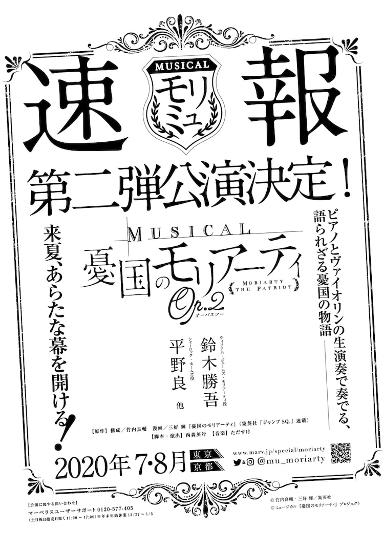 竹内良輔・三好輝原作によるミュージカル「憂国のモリアーティ」の第2弾公演が決定した。2020年7月、8月に東京・大阪で上演される。
