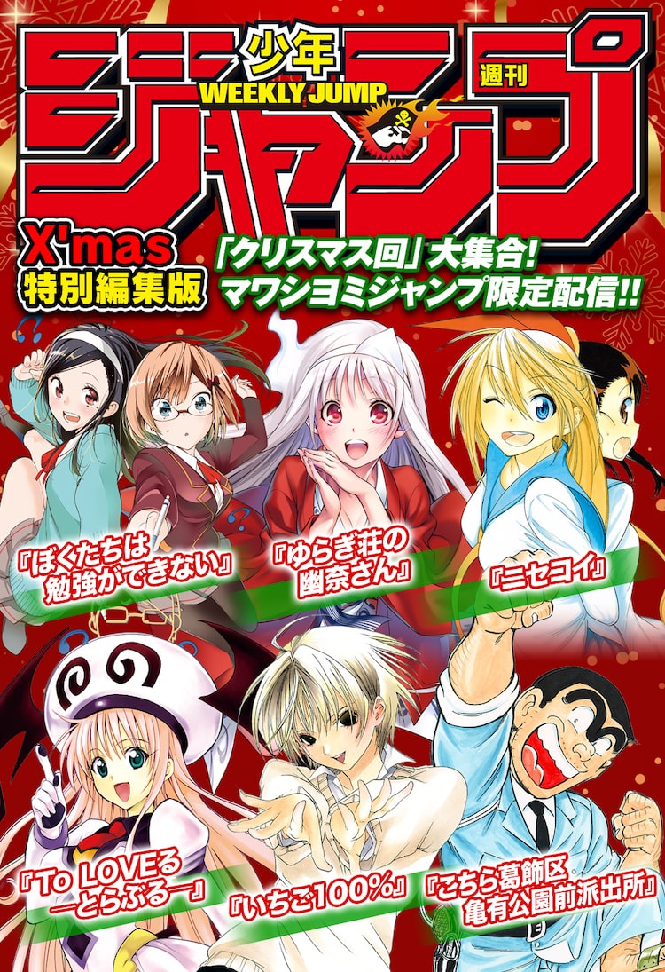 週刊少年ジャンプX’mas 特別編集版には、筒井大志「僕たちは勉強ができない」、ミウラタダヒロ「ゆらぎ荘の幽奈さん」、古味直志「ニセコイ」、長谷見沙貴脚本による矢吹健太朗「To LOVEる-とらぶる-」、河下水希「いちご100%」、秋本治「こちら葛飾区亀有公園前派出所」のクリスマスに関連するエピソードをセレクトして収録。拾ってから1週間無料で読むことができる。