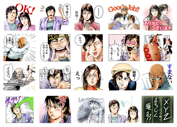 LINEスタンプは40種1セット。「もっこり▽ちゃあ~ん(▽はハート)」と目をハートにする冴羽リョウ(リョウの漢字はけものへんに「僚」のつくり)や、「この通りお願いします!」と頭を下げる海坊主などトークで使いやすい絵柄を中心に、伝言板に書かれたXYZの文字も用意された。入手には120円または50コインが必要となる。