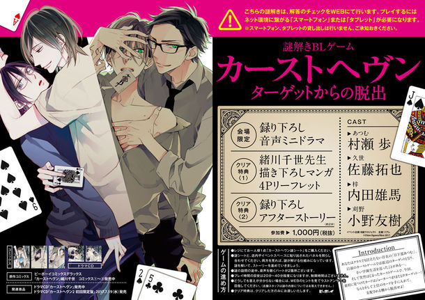 「カーストヘヴン」はクラス内で階級が決まる“カーストゲーム”に翻弄される生徒たちを描くBL。イベントではプレイヤーはあつむになって、場内に散りばめられた謎を解いていく。会場内では村瀬歩、佐藤拓也、内田雄馬、小野友樹らドラマCDキャストによる撮り下ろし音声が聴けるほか、限定グッズの販売も行われている。