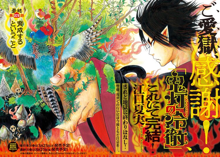 なお3月23日には「鬼灯の冷徹」の公式Twitterに掲載されたイラストをまとめた「『鬼灯の冷徹』落書き帳」、8月上旬にはカラー画集「獄彩絵画 弐~江口夏実『鬼灯の冷徹』カラーイラスト集2~」が発売予定。また完結を記念した原画展が8月12日から8月24日まで、東京都・松屋銀座8階のイベントスクエアにて開催されることも伝えられた。