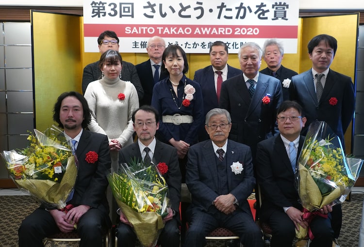 前列左から室井大資、岩明均、さいとう・たかを、沢考史氏。中列左から第1回さいとう・たかを賞を受賞した「アブラカダブラ ~猟奇犯罪特捜室~」担当編集の中山久美子氏、作者の芳崎せいむ、第2回さいとう・たかを賞を受賞した「イサック」原作者の真刈信二、担当編集者の荒井均氏。後列左から長崎尚志、やまさき十三、佐藤優、池上遼一。