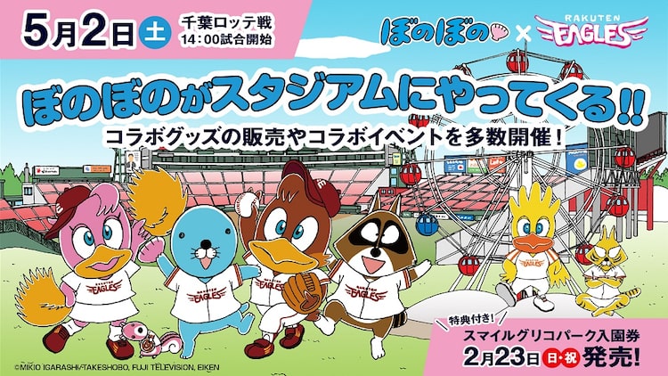 いがらしみきお原作によるTVアニメ「ぼのぼの」とプロ野球球団の東北楽天ゴールデンイーグルスがコラボレート。5月2日の千葉ロッテ戦に絡めたイベントが、宮城・楽天生命パーク宮城にて行われる。