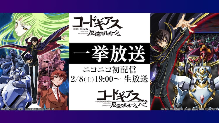 2月8日には「コードギアス 反逆のルルーシュ」のSTAGE1からSTAGE12、2月9日には「コードギアス 反逆のルルーシュ」のSTAGE13からSTAGE25、2月10日には「コードギアス 反逆のルルーシュ R2」のTURN1からTURN12、2月11日には「コードギアス 反逆のルルーシュ R2」のTURN13からTURN25を放送。さらに2019年に公開された劇場版「コードギアス 復活のルルーシュ」の動画配信が、ニコニコチャンネルにて2月8日より実施される。