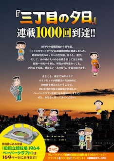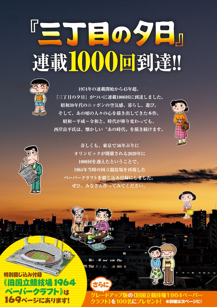 本日2月5日発売のビッグコミックオリジナル4号(小学館)にて、西岸良平「三丁目の夕日」が連載1000回を迎えた。これを記念し、同号には旧国立競技場のペーパークラフトが付録として綴じ込まれている。