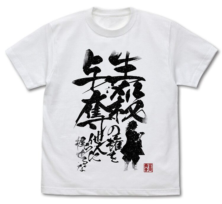 Tシャツの前面には冨岡義勇のセリフをもとに「生殺与奪の権を他人に握らせるな」という文言を大きくプリント。背面上部には日輪刀と「鬼殺隊 水柱」「冨岡義勇」の文字があしらわれている。