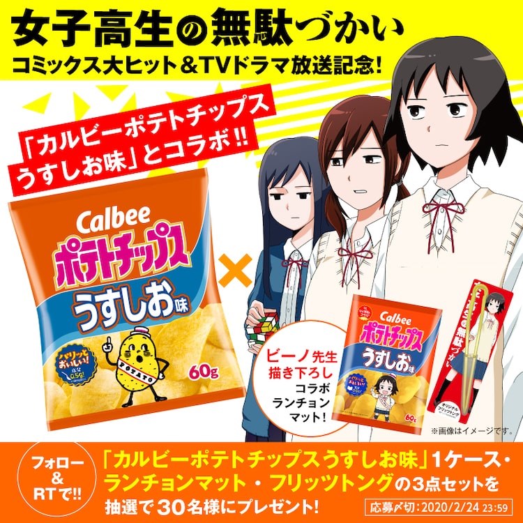 ビーノ「女子高生の無駄づかい」と「カルビーポテトチップス うすしお味」のコラボによるTwitterキャンペーンが、本日2月10日から24日23時59分まで実施されている。