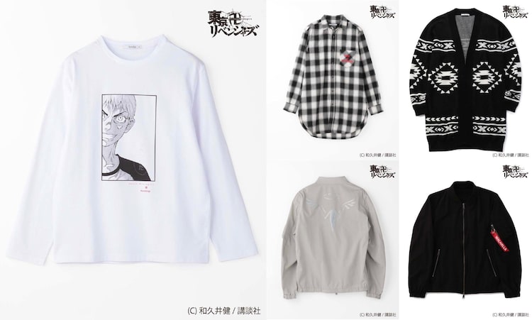 このたびのコラボレーションでは、スマートフォンのフラッシュ撮影を行うと名場面のセリフが浮かび上がるリフレクタープリントを施したカットソーに加え、登場人物が着用するアイテムを再現した商品が登場。マイキーこと佐野万次郎が単行本6巻の表紙で着用しているロングチェックシャツ、副総長・ドラケンこと龍宮寺堅が着用しているニットカーディガン、芭流覇羅(バルハラ)が特攻服として着用するブルゾン、東京卍會のチーム旗に描かれている「TOKYO GANG」をアレンジしたライダースといったアイテムがラインナップされた。