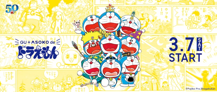 藤子・F・不二雄「ドラえもん」の50周年を記念し、雑貨ストア・ASOKO、ファッションブランドのGU(ジーユー)とのコラボグッズが、3月7日より発売される。