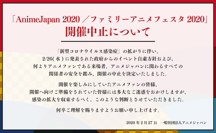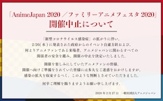 「AnimeJapan 2020」開催中止 2020年2月27日2020年2月27日 editor 「AnimeJapan 2020」開催中止のお知らせ。3月21日から24日にかけて東京・東京ビッグサイトで開催される予定だったアニメイベント「AnimeJapan 2020」の開催中止が発表された。 開催中止は新型コロナウイルスによる感染症の拡大を受けて決定されたもの。チケットの払い戻しについては、すべての券種で対応するとされる。詳細は3月6日以降、公式サイトにて発表予定だ。なお同時に開催予定だった「ファミリーアニメフェスタ 2020」も合わせて開催中止となる。 関連記事小冊子「キャラットちゃん20歳」付き、きららキャラット独立創刊20周年号が発売「SAKAMOTO DAYS」初公開の情報満載のファンブック、読切「SAKAMOTO」も「えんとつ町のプペル」新たなルビッチ役は永瀬ゆずな、満場一致で「見つけた!」ひろしまアニメーションシーズンのプログラム発表、「トットちゃん」監督のトーク実施望月淳の画業20周年ポプショ、新グッズに「画業が20周年の公式なのにうすいほん」寺島拓篤とスフィア登壇のAT-Xブース、スフィアはキャンピングカーで15年振り返る Tweet
