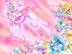 1枚目のスチールに描かれているのは、12人のプリキュアがミラクルンライトを握り締め応援する中、スーパーグレースにパワーアップしたキュアグレースの姿。2枚目のスチールには引き連れていたモンスターと合体し巨大化したリフレインに立ち向かうキュアグレース、キュアスター、キュアエールの姿が収められている。