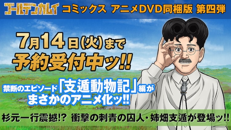 15巻、17巻、19巻に続き第4弾となる「ゴールデンカムイ」のアニメDVD同梱版単行本。DVDには動物を惨殺した犯人として捕らわれてしまった谷垣を助けるため、真犯人を追う杉元たちを描いた支遁動物記編のアニメが収録される。なお同エピソードに登場する姉畑支遁役は堀秀行に決定。姉畑の役どころについて聞いた際のことを「えっ! 何それ? …いくら放送用ではないにしても、それ大丈夫? ありなの? と同時に、ちょっと面白い役かもって思い、出演OKと答えました」と振り返る堀は、「録音当日監督からは、けして変態にはしないでねって念を押されたけど、でも変態じゃんって思いながら結構楽しみながら演じることが出来ました」とコメントしている。