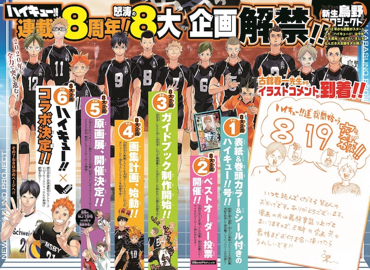 なお本日3月16日発売の週刊少年ジャンプ16号では、「ハイキュー!!」が連載開始から8年と19日を突破したことを記念し、同作が表紙と巻頭カラーで登場。原画展開催のほか、ガイドブックや画集の制作、「ベストオーダー投票」、Vリーグとのコラボなど8大企画が発表された。なお少年ジャンプ+と集英社の総合電子書店・ゼブラックでは、本日から4月5日23時59分まで「ハイキュー!!」1巻から28巻を無料公開している。
